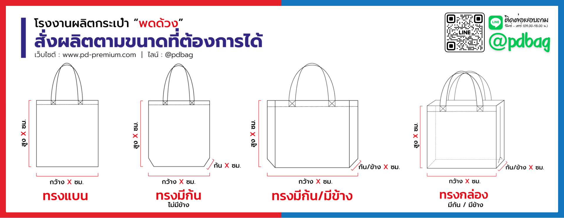 โรงงานผลิตกระเป๋าผ้า ยินดีรับผลิต กระเป๋าผ้า ถุงผ้า สกรีนโลโก้ ปักโลโก้ กระเป๋าพรีเมี่ยม สกรีน กระเป๋าผ้าดิบ ถุงผ้าดิบ กระเป๋าหนัง ปั๊มโลโก้ โดยกระเป๋าพรีเมี่ยม ต่างๆ ผลิตจากโรงงานกระเป๋าผ้า ถุงผ้าของ บริษัทฯ โดยตรง โดยโรงงานผลิตกระเป๋าผ้า ของเรายินดีรับผลิตกระเป๋าผ้า ถุงผ้า ของพรีเมี่ยม ตามแบบลูกค้า (made-to-order) ไม่ว่าจะเป็น กระเป๋าผ้าดิบ ถุงผ้าดิบ กระเป๋าผ้ากระสอบ สกรีนโลโก้ กระเป๋าผ้าแคนวาส กระเป๋าอเนกประสงค์ กระเป๋ายีนส์ กระเป๋าผ้า600D กระเป๋าลดโลกร้อน กระเป๋าหนัง กระเป๋าแจก ต่างๆ ได้ตรงตามความต้องการของลูกค้าได้มากที่สุด